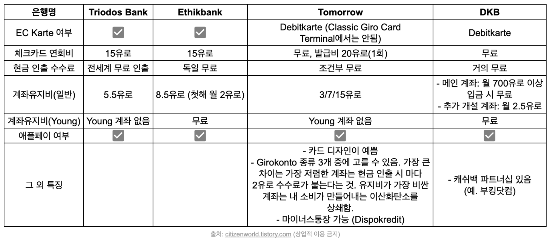 은행 계좌를 비교하는기 위해서는 정말 많은 카테고리가 있다. 따라서 여기서는 나의 개인적인 필요에 의한 비교표를 작성해 보았다. 일단 보통예금계좌(Girokonto), 가능하면 EC Karte(GiroCard)일 것, 계좌 유지비가 너무 비싸지 않을 것, 체크카드 연회비가 저렴하거나 무료일 것 등의 기준이 적용되었다. 직접 만든 표이기 때문에 불펌은 안하셨으면 좋겠고, 상업적 이용은 더더욱 금지이다.