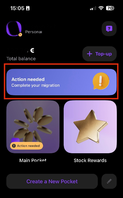 그 다음 업데이트를 하고 나면 바로 이전 작업을 안내하는 팝업이 뜨는데, 만약 아직 기존의 정보 (계좌 잔액, 계좌 번호 정보 등)을 확인을 제대로 못해서 이전을 바로 하고 싶지 않다면, 이 때 바로 하지 않고 X 버튼을 눌러 닫아도 괜찮습니다. 저도 혹시 몰라 바로 진행하지 않고 계좌 잔액을 모두 스샷으로 찍어두고, 계좌 잔고 PDF 파일과 거래 내역 파일도 모두 PDF로 다운 받은 뒤에 진행했습니다. 다시 이전 화면으로 접속하려면 Vivid 앱 메인 화면에서 'Action needed'라고 적혀있는 배너나 Main Pocket(메인 계좌)를 누르면 됩니다.