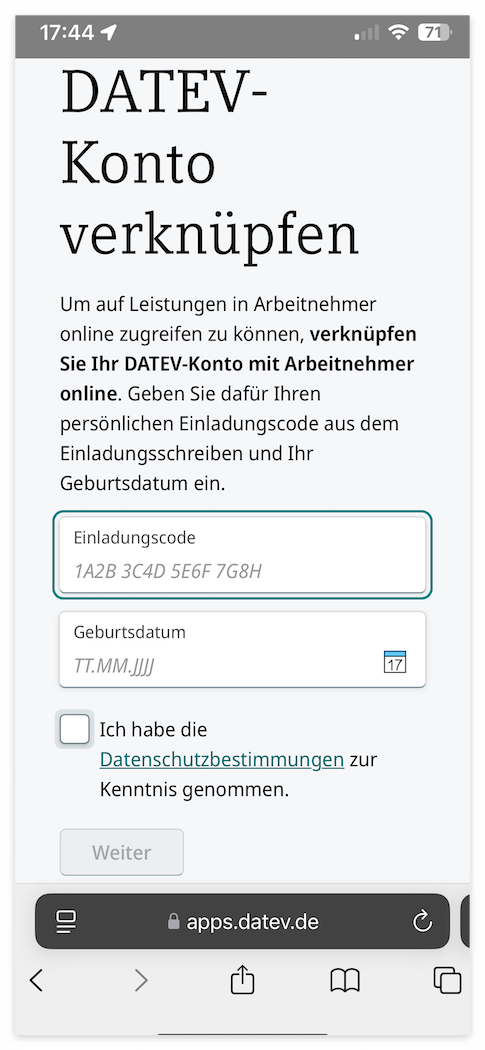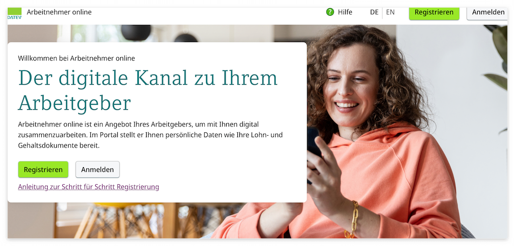 - Datev 계정 만들기 위해 편지에 적힌 홈페이지로 접속 (www.arbeitnehmeronline.de)