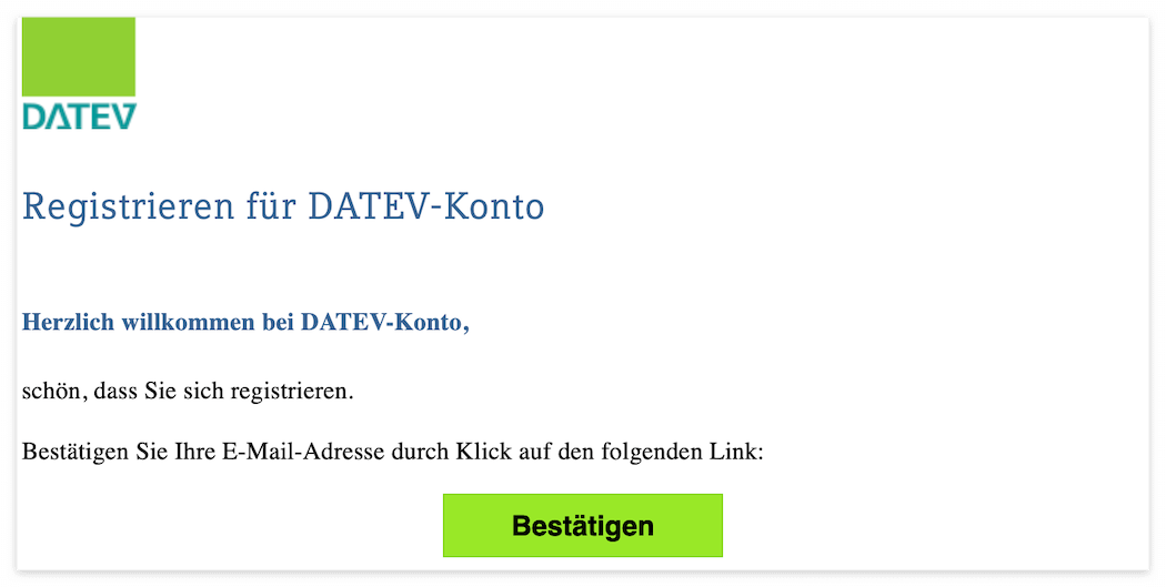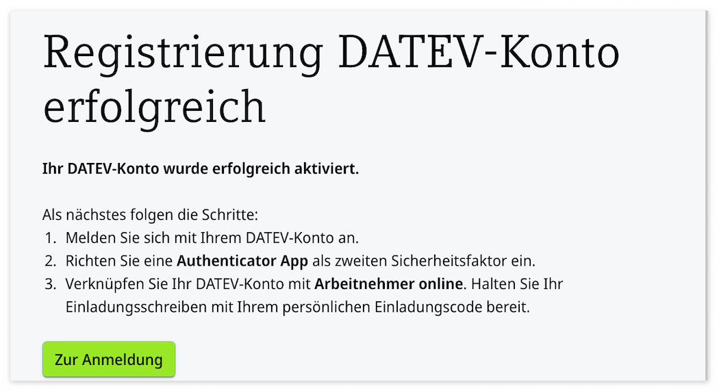 - 이메일에서 Bestätigen을 누르면 이메일 인증이 되면서 새 창으로 위와 같은 페이지가 열린다. 만약 위 화면이 안나와도 앞의 홈페이지에서 로그인하기(Anmelden)을 클릭한다. (후자의 경우 DATEV-Konto mit Authenticator App 로그인 선택)