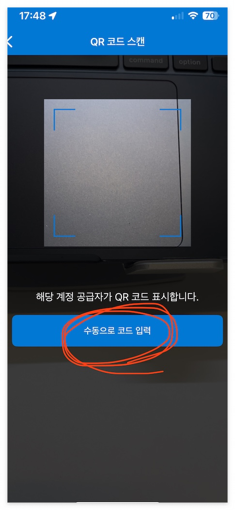 3. QR코드를 카메라로 찍거나 수동으로 코드를 등록한다.