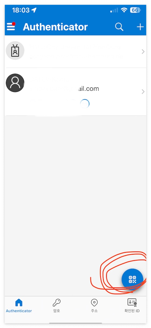 2. 마이크로소프트 인증앱 메인 화면 오른쪽 아래에 있는 파란색 동그라미 버튼을 누른다 (아래 스샷 참고).